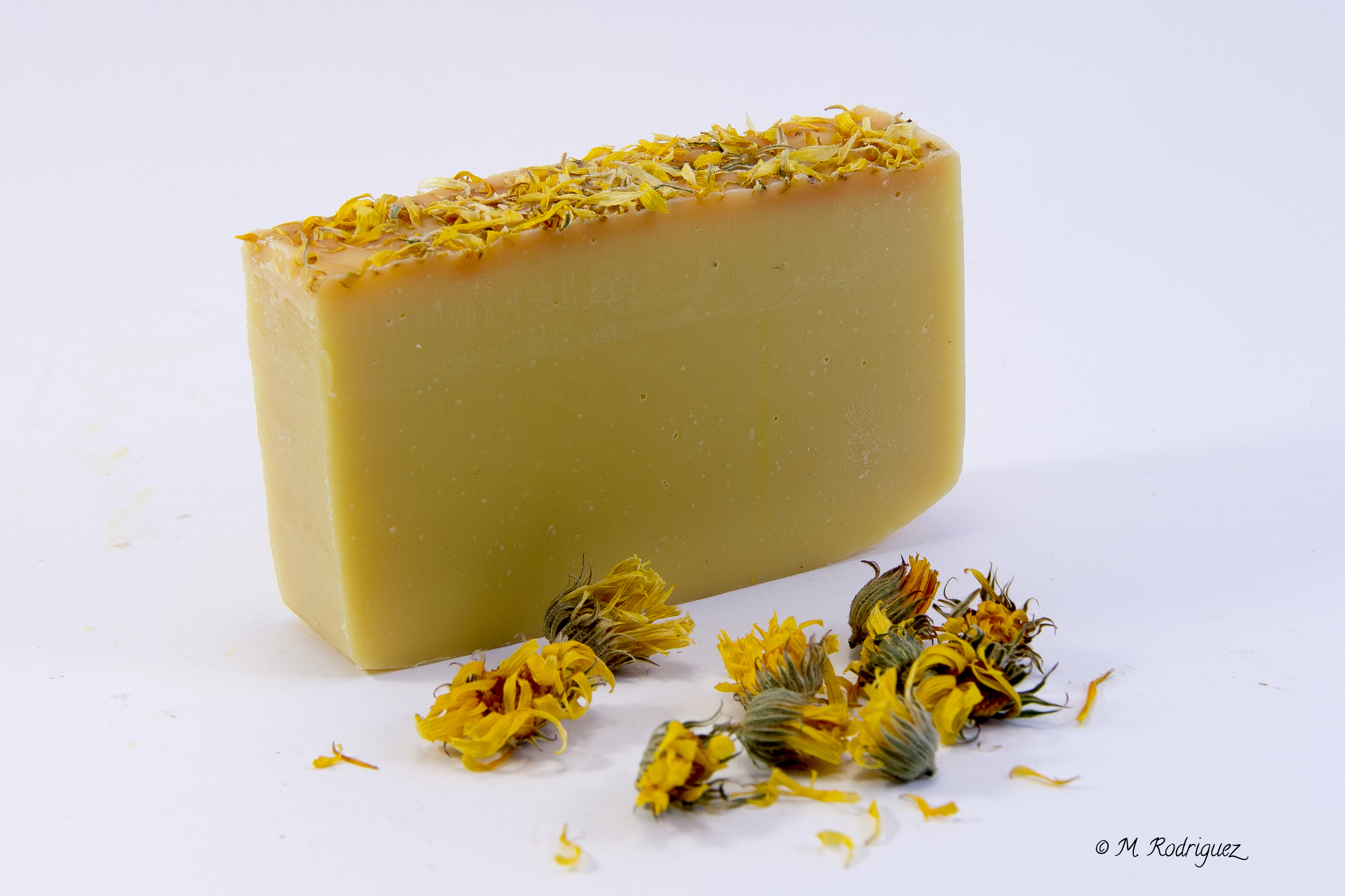 - Con oleato de flores de caléndula en aceite de oliva virgen, almendras, aguacate, coco, germen de trigo, manteca de cacao y manteca de karité.